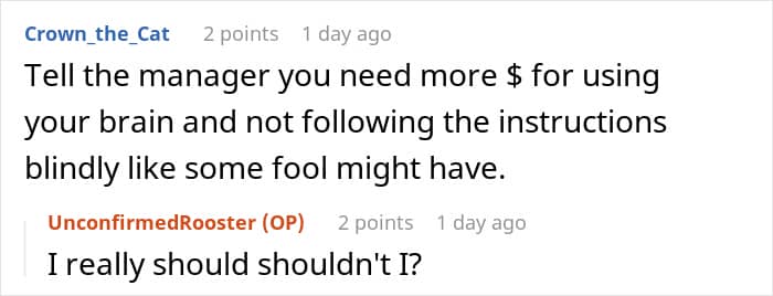 People in the comments cracked up at the hapless manager, and also advised the author to always ask for a written confirmation for such orders, just in case…