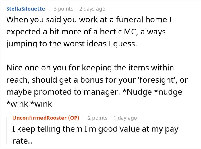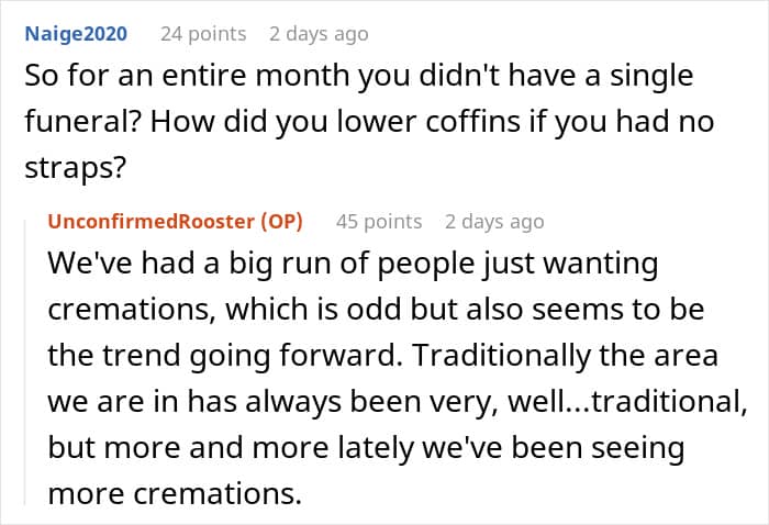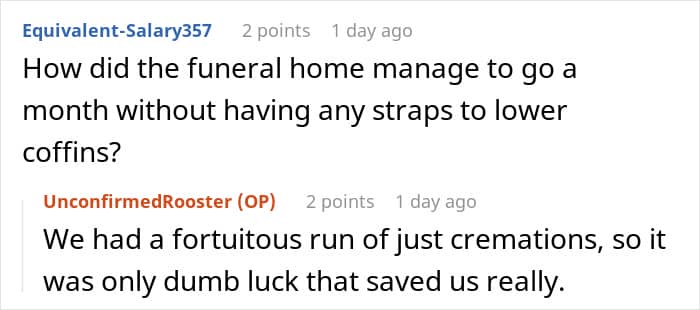 In general, the OP received a direct order to collect everything and throw it away. However, they had the patience to take the new straps and still hide them at home. This went on, according to the author, for about a month, when all funeral cases were cremations only… and then, one fine day, a client appeared who required a standard burial – and the same manager suddenly asked how many straps they had for work.