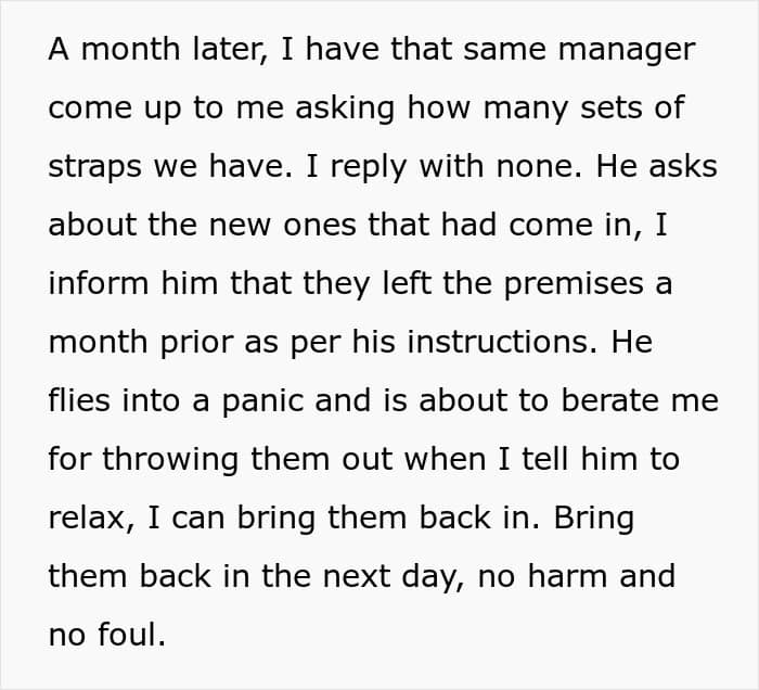 Having received a reasonable answer that not a single one remained, the boss completely lost it, and guess who they accused of incompetence and negligence? That’s right, the original poster! Fortunately, the OP’s foresight saved the situation – because they calmly stated that they would now go and bring the brand new straps, which the boss had so persistently ordered them to throw away. “Certainly bruised that manager’s ego a bit and made him think about what he says next time though,” the author muses.