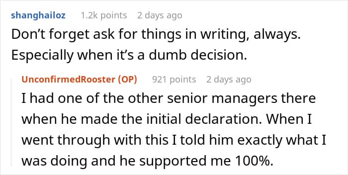 That is, by the way, a truly great piece of advice. For example, in this post of ours you can read how this rule literally saved one employee not only from inevitable dismissal, but even from legal trouble. So, if you have also encountered similar examples of reckless orders from your higher-ups, please feel free to share your stories in the comments below this post.