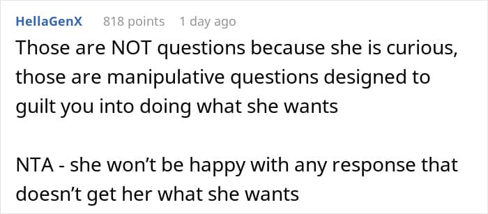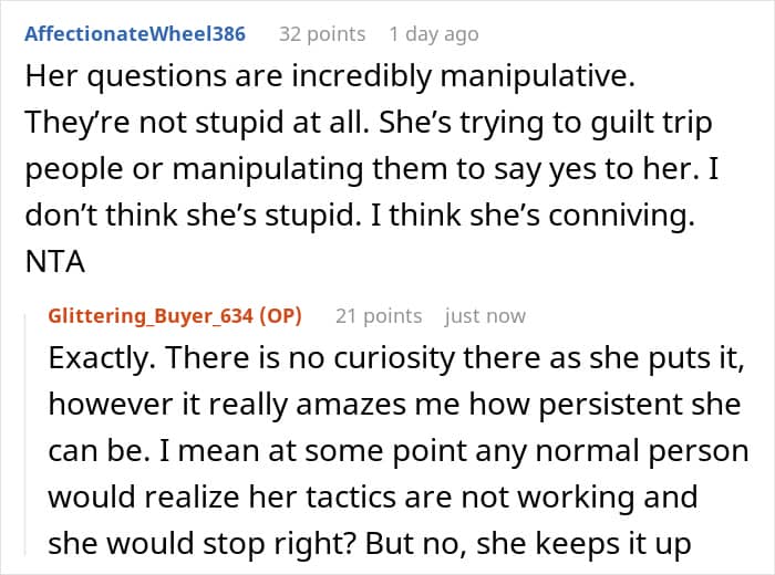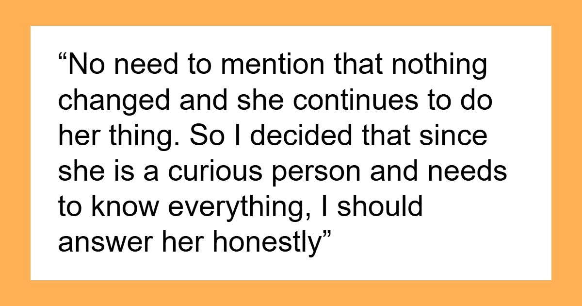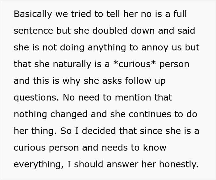 OP tried to talk to her nicely at first. She explained that “no” is a complete sentence, and constant questioning isn’t endearing—it’s exhausting. Ellie, however, insisted she was “just a curious person.” So, OP changed tactics. If Ellie needed answers so badly, she’d give her brutally honest ones with no sugarcoating, and no diplomacy, just cold, hard facts.