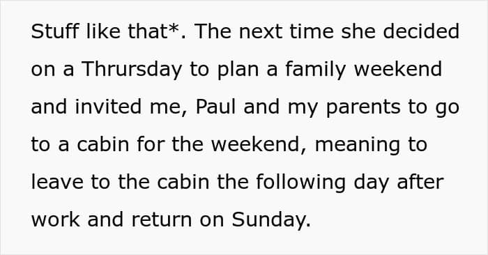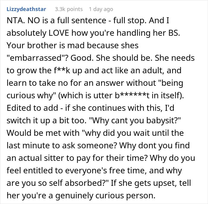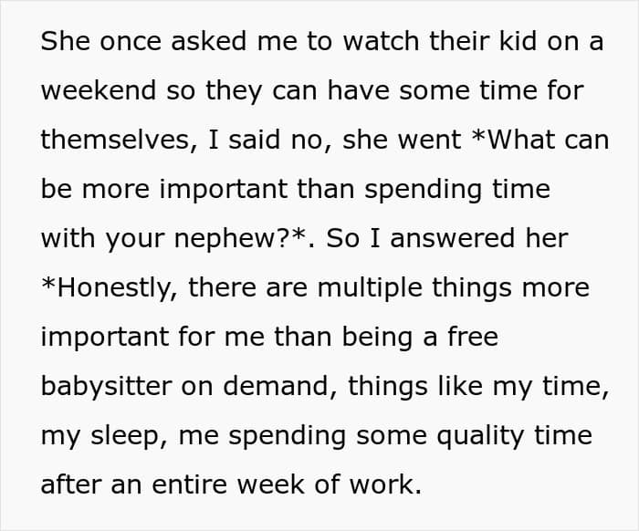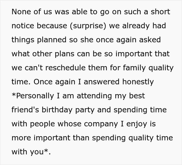 When Ellie asked for weekend babysitting, she got 100% honesty. OP simply explained that her time, sleep, and peace were more important than being a free babysitter. Another time, Ellie planned a last-minute family cabin trip and was shocked when no one could go. When she asked why, she was basically told, “Because I’ve got plans to hang out with people I actually like.”