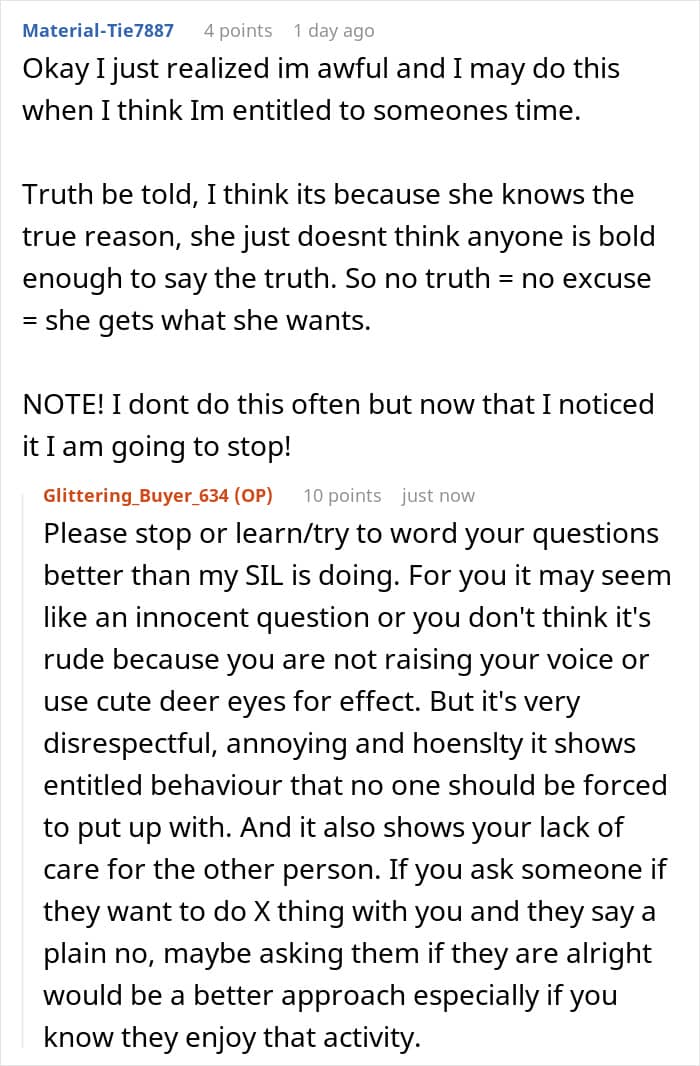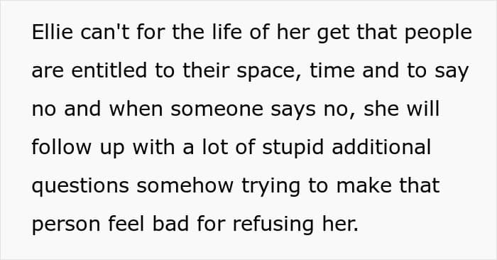 Some people think “no” is a suggestion—not a boundary. OP shared how her sister-in-law, Ellie, never seems to grasp that other people’s time isn’t hers. Ellie doesn’t drive (but expects others to shuttle her), overplans everyone’s weekends, and gets offended when people refuse her demands. Her default reaction? Guilt-tripping questions and passive-aggressive follow-ups.