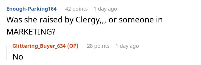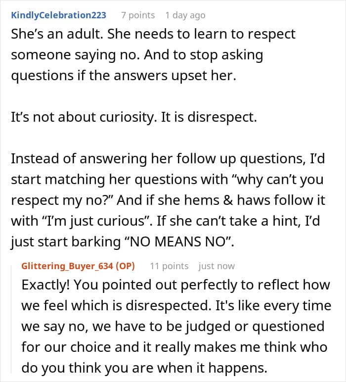 Ellie’s husband, Ben, didn’t take it well. He accused OP of humiliating his wife, but she wasn’t having it. As far as she was concerned, Ellie was doing it to herself by refusing to respect boundaries. The conclusion? If she doesn’t want to be embarrassed, she should stop with the endless, maddening questions.
