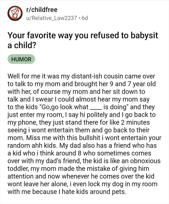 Yes, it should be noted that the thread, a selection of stories we offer for your attention today, originally appeared in the Reddit Childfree community when the user u/Relative_Law2237 asked people: “Your favorite way you refused to babysit a child?”, then started with their own story.