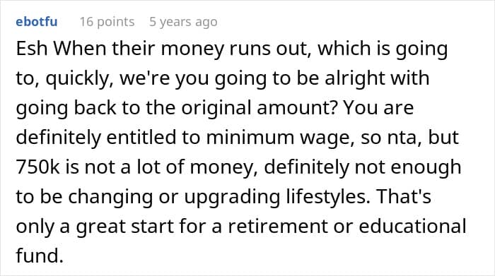 After reading the dramatic AITA post, many internet users weighed in with their thoughts about personal finances, spending, saving, and earning a fair wage. The story garnered 2.2k comments and 18k upvotes as it went viral online. Unfortunately, the author’s account got suspended, so we were unable to reach out to them for an update.