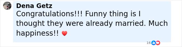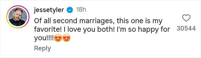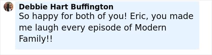 “Of all second marriages, this one is my favorite! I love you both! I’m so happy for you!!!!” commented Jesse Tyler Ferguson, who played Eric’s on-screen husband Mitchell Pritchett to his Cameron Tucker on the hit show Modern Family.