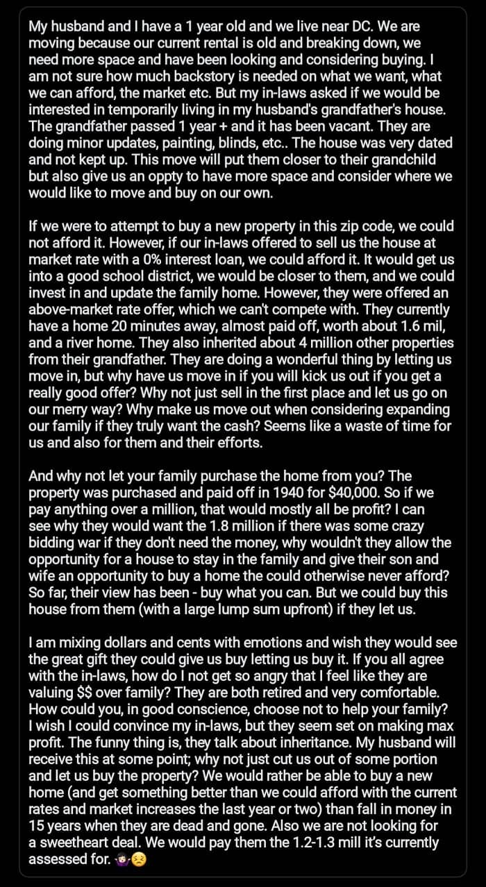 #56 Entitled Dil Wants In-Laws To Sell Her Their $1,000,000 House For 0% Intrest Because “It Was Worth $40k When They Bought It During Ww2, So Anything Paid Above That Is Pure Profit”