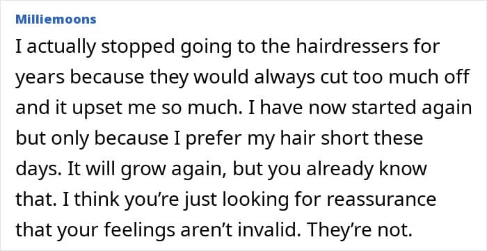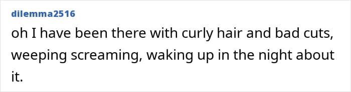 A lot of commenters noted roughly the same thing, although they admitted that comparing the emotional state after the death of a parent to after an unsuccessful haircut is a tad bit weird. However, some responders still understood perfectly how our heroine felt. “I had this once, and I cried for two days,” someone wrote. “It sounds ridiculous but I was so upset.”