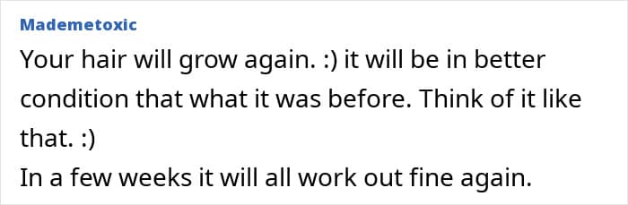 The readers also tried to morally support and encourage the woman, assuring her that her hair will grow back anyway, and in the meantime, she could demand a refund from the salon for this sad experience. “It will grow, have faith,” another netizen added wisely. So what would you, our dear readers, advise this lady? Please feel free to share your thoughts in the comments.