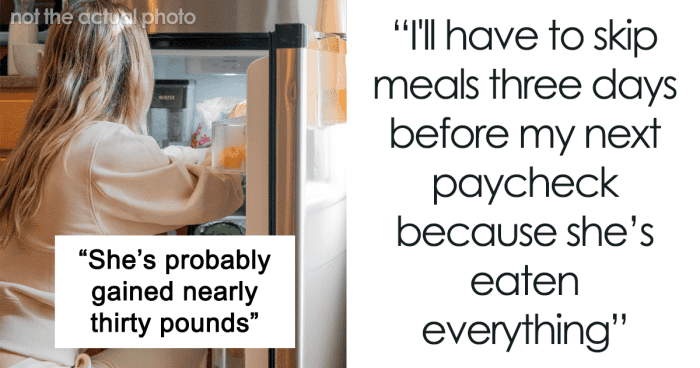 “She’ll eat everything she wants, and leave me with plain crackers or lettuce. I mean, everything. Even stuff I’ve specifically labeled or said I want. The cupboards will be bare and I’ll have to skip meals three days before my next paycheck because she’s eaten everything,” the OP vented on the AITA subreddit.