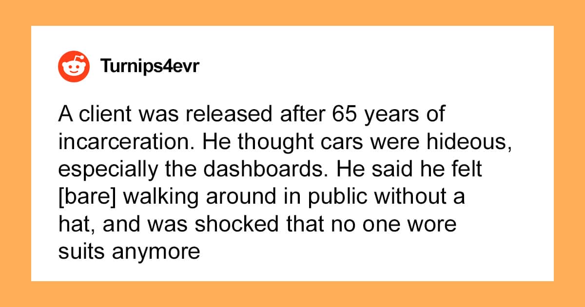 I worked in community corrections in the past. I had one client who was released after 65 years’ incarceration. He thought cars were hideous, especially the dashboards, and would not shut up about this. He said he felt naked walking around in public without a hat, and was shocked that no-one wore suits any more. He had forgotten about mosquitoes and was also mad about that. He did eventually buy a modern pickup and a smartphone, and immediately got into Candy Crush and Slots.