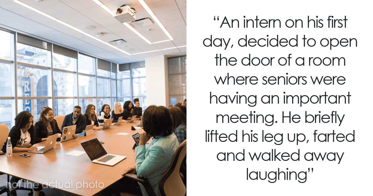 An intern on his first day, decided to open the door of a room where a few of the seniors were having an important meeting. He briefly lifted his leg up, farted and walked away laughing.