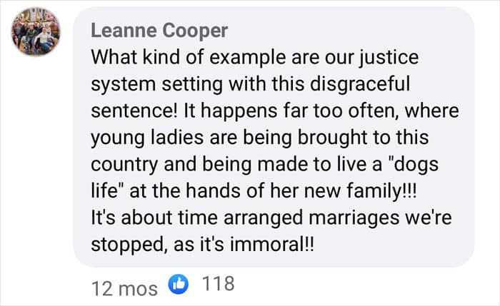 “What kind of example are our justice system setting with this disgraceful sentence!” a user asked. “It happens far too often, where young ladies are being brought to this country and being made to live a ‘dogs life’ at the hands of her new family!!!”