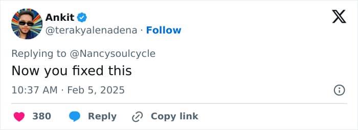 The tweet, shared by Nancy Soulcycle, generated hysterical comments.