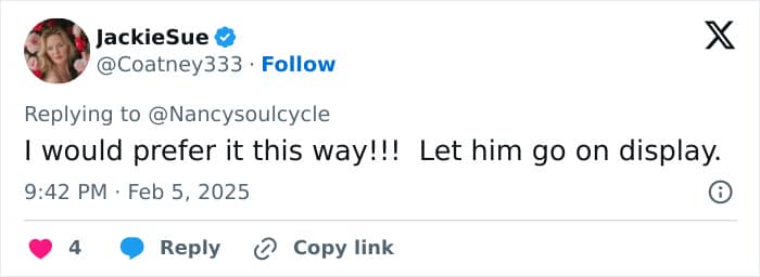 “I would prefer it this way!!! Let him go on display,” another jabbed.
