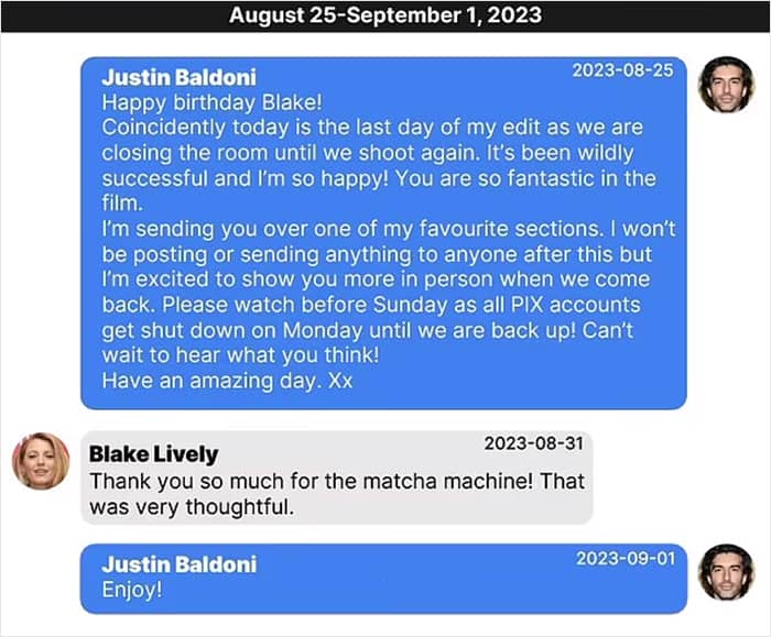The timeline includes Baldoni’s initial text messages with Lively, which suggested they had a friendly relationship before things turned sour.