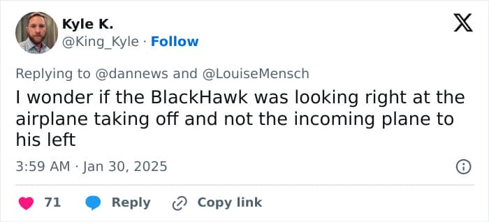 “I wonder if the BlackHawk was looking right at the airplane taking off and not the incoming plane to his left,” speculated @King_Kyle.