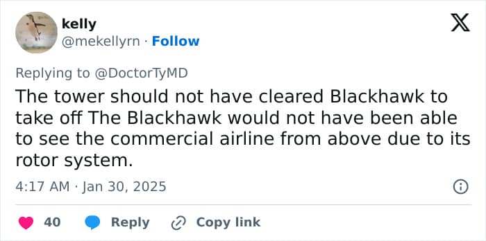“I teach blackhawk pilots how to fly at night,” @SnakPakFlight commented on X. “You can hear the Blackhawk pilot confirm visual of the jet 5 seconds before impact. Could have been looking at another aircraft.”