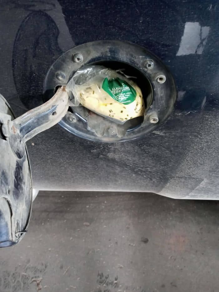 #117 This Guy Crammed A Bag Of Garlic Cheese Curd Inside The Fuel Filler Door On Top Of The Gas Cap. Either He Though That Would Fix His Evap Leak, Or Lactose Intolerant Vampires Kept Syphoning His Fuel