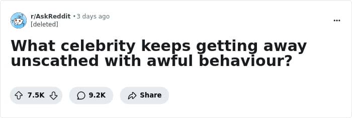A few days ago, a now-deleted Reddit user asked everyone on the platform to share which celebrities they believe keep escaping the consequences for their actions, and since then, thousands have submitted their responses. Continue scrolling to check out the most popular names on the list and upvote the ones you agree with.