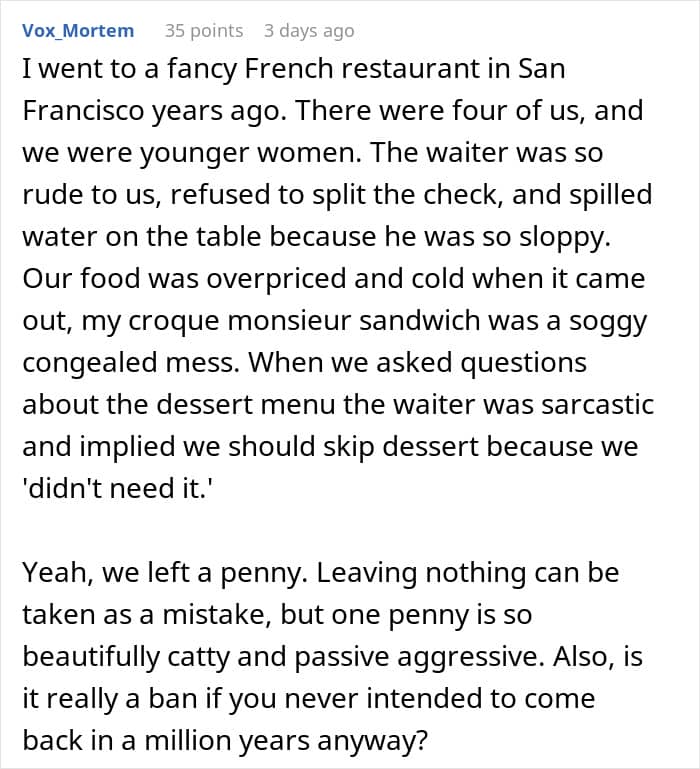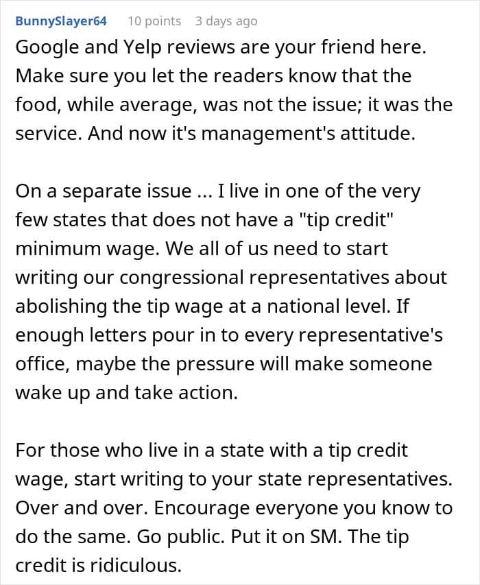 But the redditor was rather kind to leave a 10% tip despite not getting good service, as many other people would have left nothing in her situation. A YouGov survey from last year found that roughly a half of Americans, including both customers and restaurant staff and managers, believe that it’s acceptable to leave zero tip after receiving bad service.