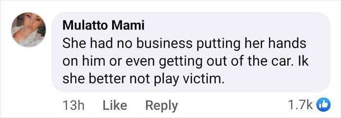 The clip sparked divided reactions as a Facebook user commented: “She had no business putting her hands on him or even getting out of the car. Ik she better not play victim.”