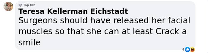 Further procedures on her face may include a nose job and a brow lift, or botox to alter the top half of her face.