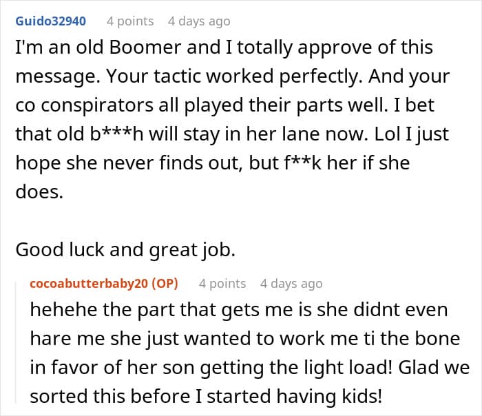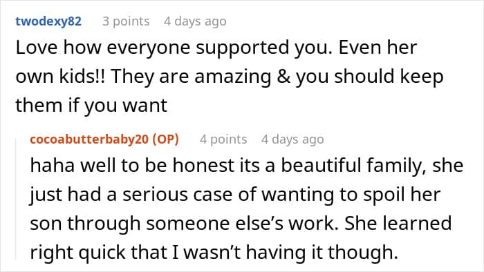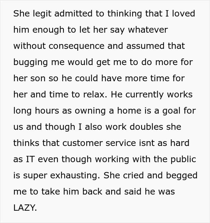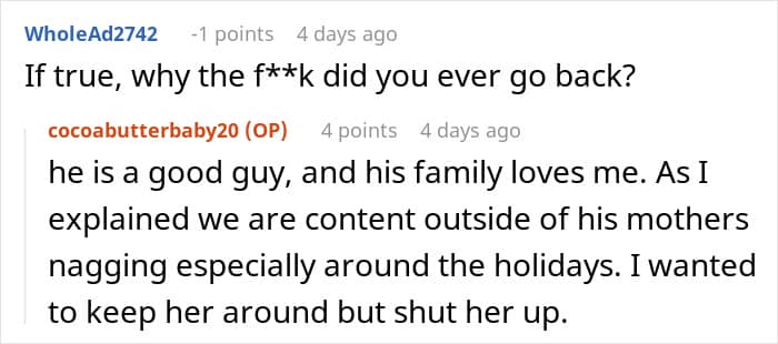 Of course, it’s also possible that she is just the sort of person who nags a lot, without actually thinking it through. For example, “wondering” if her son could have a better partner, until the reality of what that could look like sinks in. After all, some folks only learn from their own mistakes, so they need to actually face consequences to grow in any way. At least as far as mothers-in-law go, she is hardly the worst.