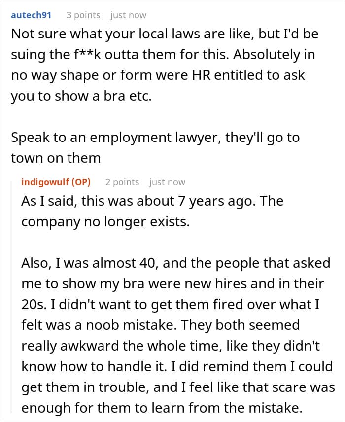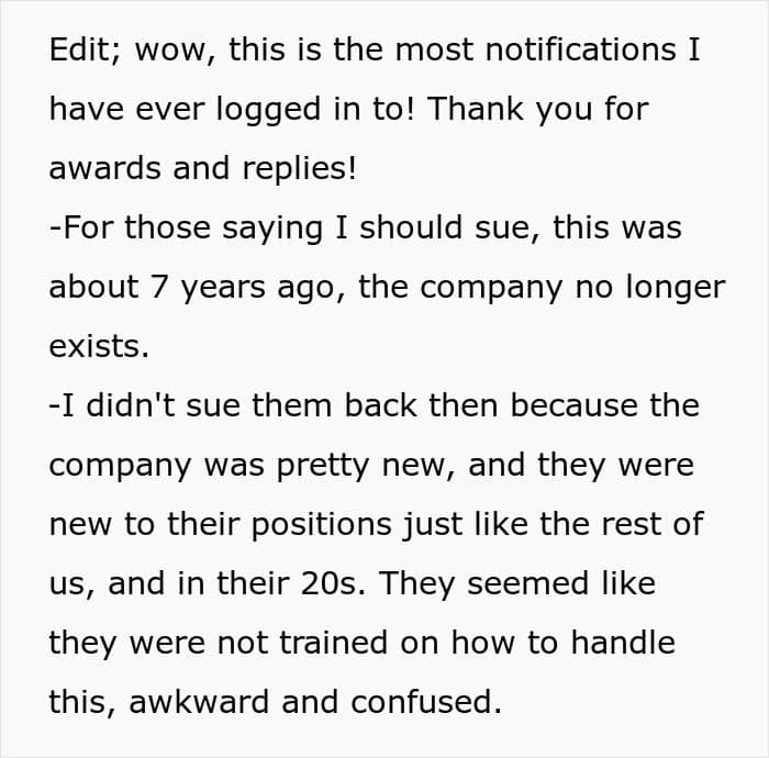 “It was a job, it paid the bills, I had some cool coworkers and they were the best part about the job,” the woman toldWe. “HR was half my age, we were all new hires because the business was relatively new itself. I don’t blame HR, they seemed so awkward about the whole thing, like they were not trained on how to handle this. That’s why I only reminded them that I could report them, and did not actually do it. I didn’t want to ruin their lives.