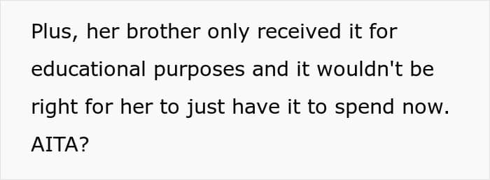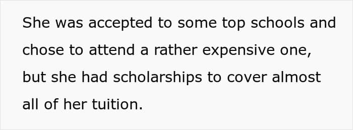 However, since he lacked scholarships, the OP and his wife used his education fund to fully cover his tuition and living expenses. This allowed him to live comfortably in a large apartment close to his school—something his sister never had. When the OP’s daughter asked how her brother was able to afford everything while she struggled, she learned about the fund and was shocked.