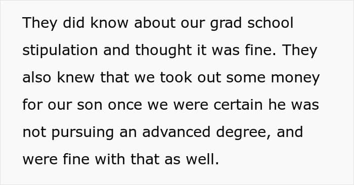 Netizens were brutally honest by calling out the OP and his wife as unfair. Many pointed out that both children made the same decision—skipping grad school—yet only the son benefited from the education fund.