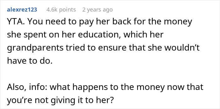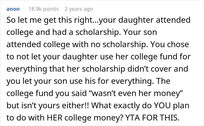 Today’s Original Poster (OP) is a father who had the means to cover his children’s education from a fund that was set up by his parents. However, instead of using it for his daughter who struggled to get by in college, he only used it for his son.