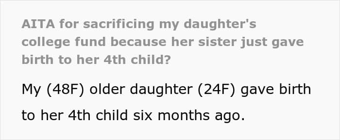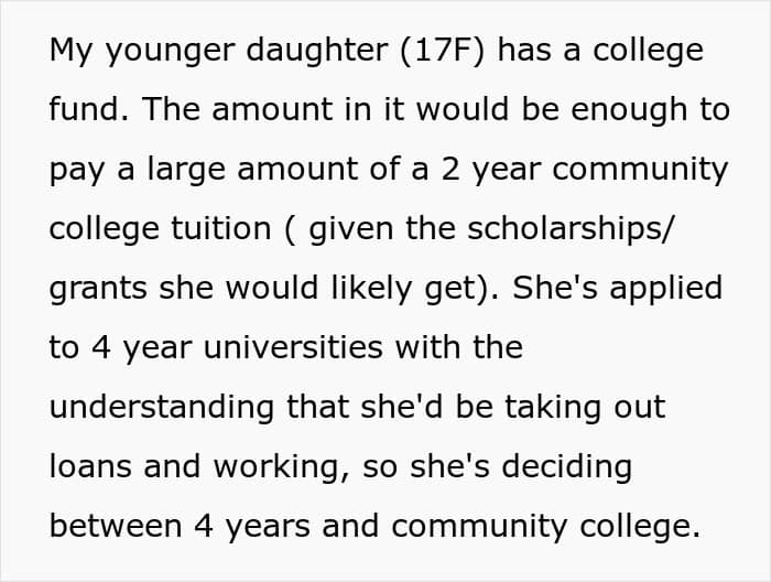 Things aren’t looking good. The mom has a lot of empathy for the daughter, so she wanted to help. However, the way she decided to remedy the situation was to sacrifice her younger daughter’s college fund. That’s said to be enough to pay a large chunk of a 2-year community college tuition.