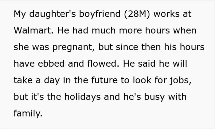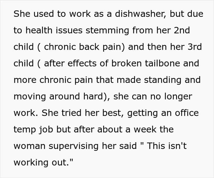 Sure. But the context is that since child #2, the daughter developed health issues which only got progressively worse with each consecutive birth. To make matters worse, her health has effectively forced her into office jobs, the search for which isn’t going all that well.
