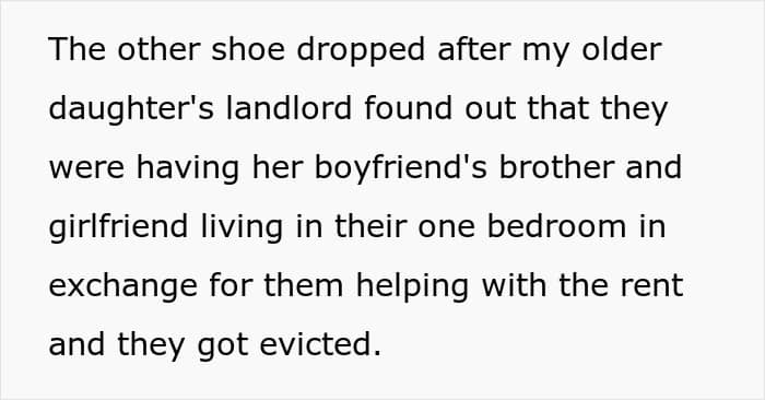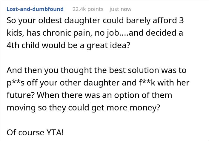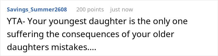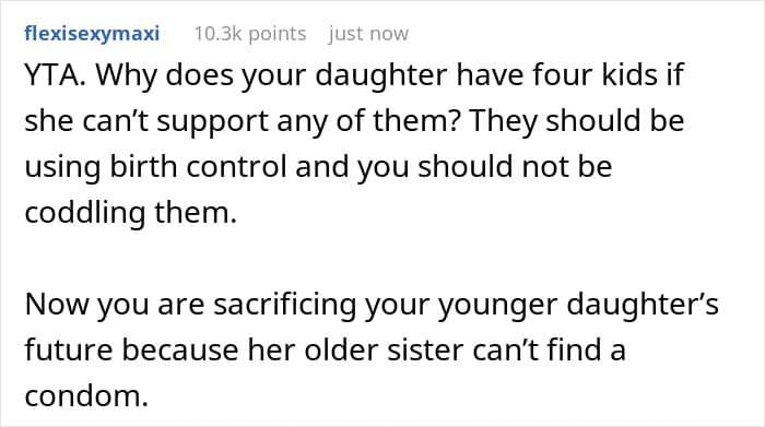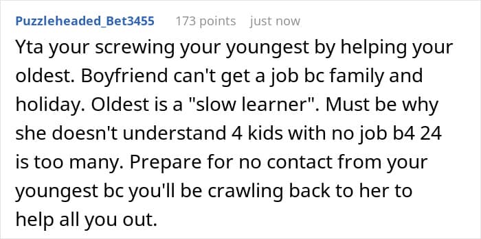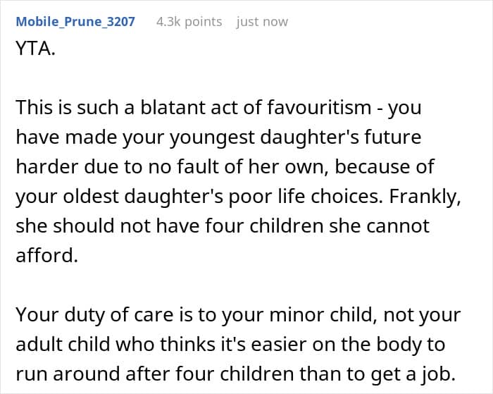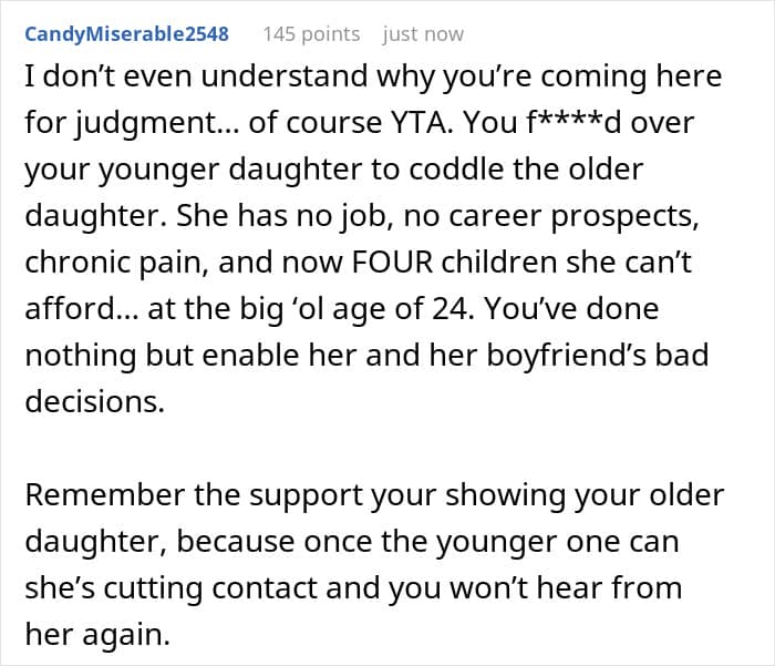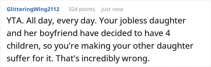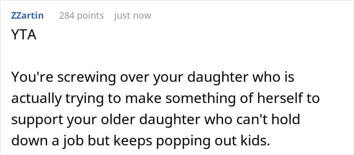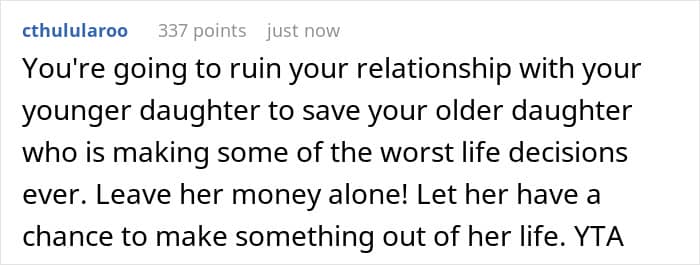 Others pointed out favoritism. The mother’s solution was to essentially reward the older daughter’s poor life choices at the expense of the younger daughter’s future. As a result, neither her nor the older daughter should expect any help from the younger daughter in the future.