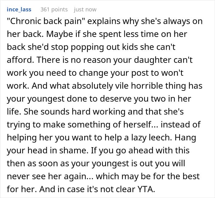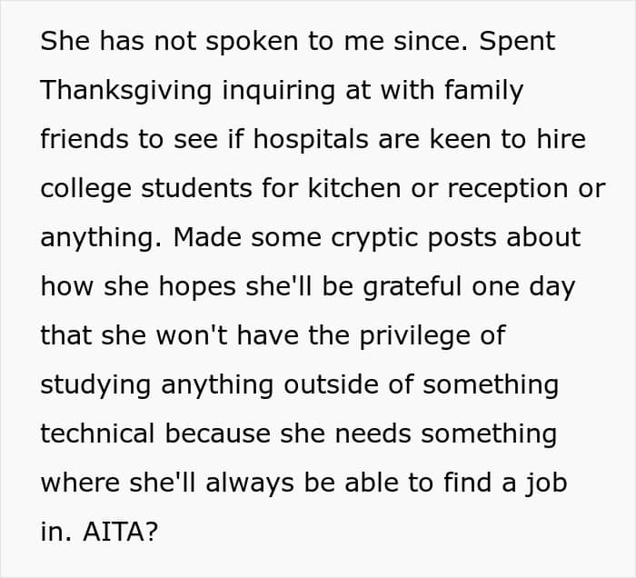 What’s more, OP took away the money from a daughter who was actually putting in the effort to make something of herself. And now the mother made it harder to do that.