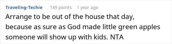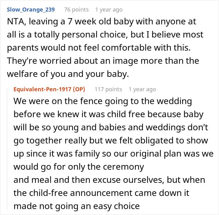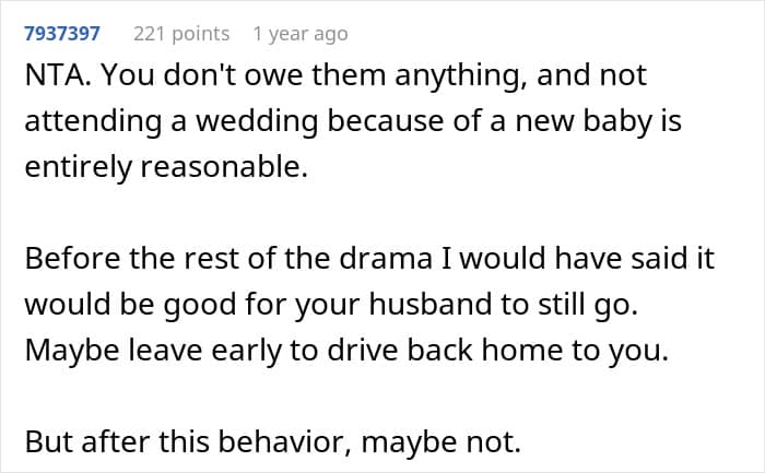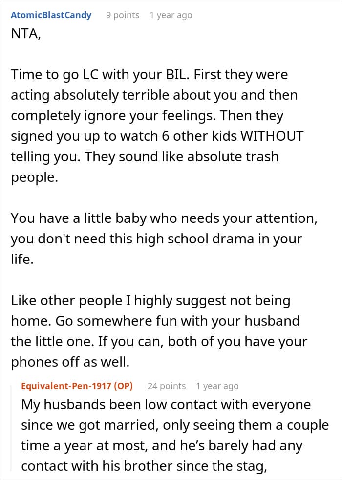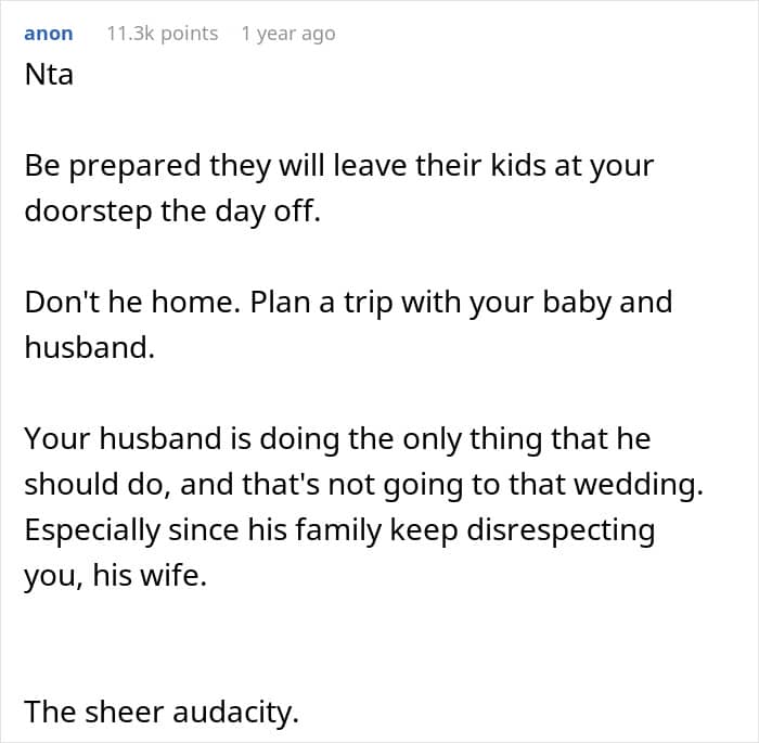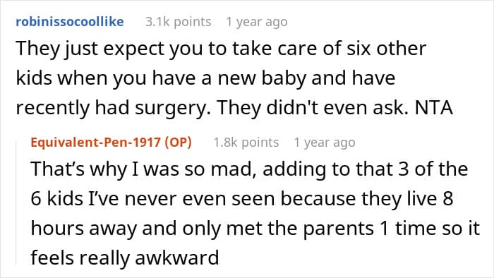 A new mom, living just two hours from the wedding venue, shared how her brother-in-law expected her to babysit six children during his wedding