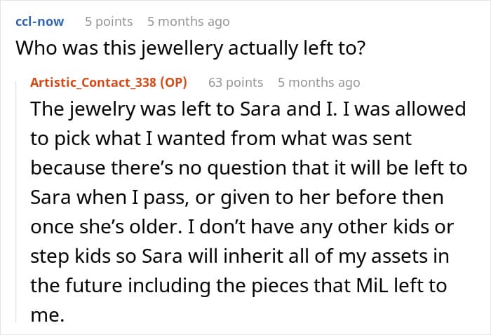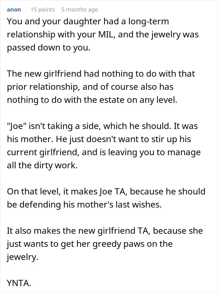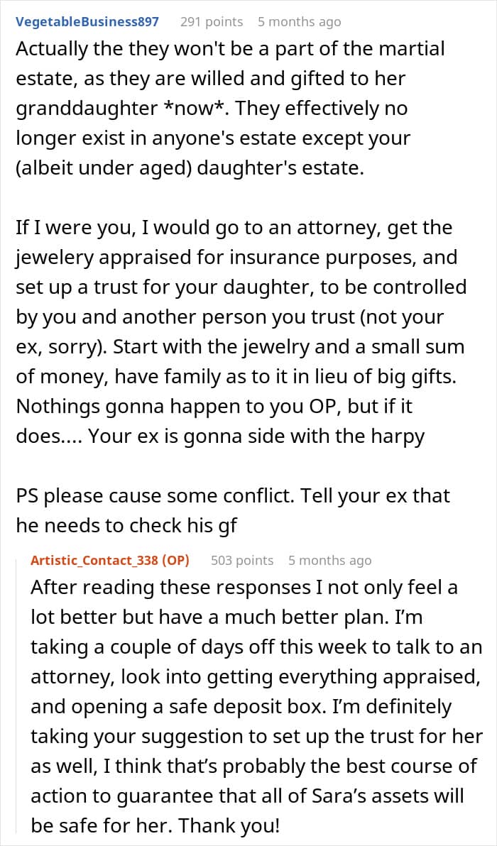One woman shared her story of a conflict over such a treasured item: an heirloom jewelry collection left for her young daughter by her late ex-mother-in-law. Her ex-husband’s girlfriend, however, began pressing her to borrow some of the jewelry, creating unexpected friction. Keep reading to find out how this family heirloom sparked a surprising debate over rightful ownership. And don’t forget to check out our interview with Ankur Jain, an estate lawyer from India.