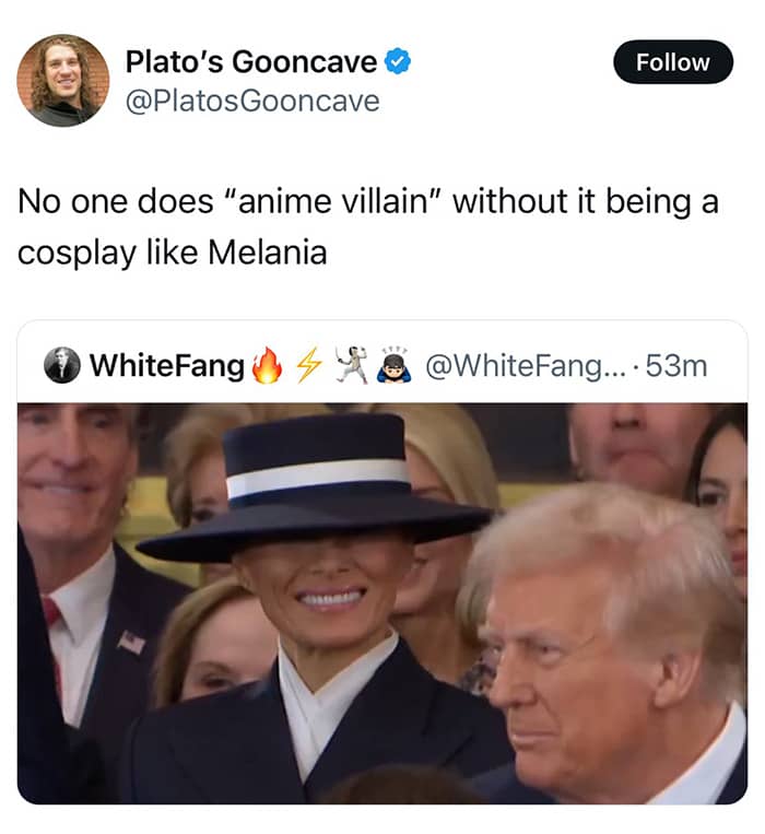 Highlights Melania Trump’s inauguration outfit sparked hilarious pop-culture comparisons. Viewers compared her look to Michael Jackson, Darkwing Duck, and anime villains. Her dark navy ensemble by Adam Lippes received mixed reactions, including a ‘mobster’ vibe. The outfit contrasted with her 2017 inauguration’s more colorful Ralph Lauren ensemble.