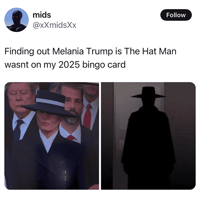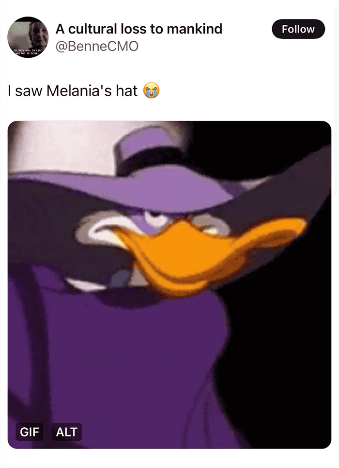 Some even said that Melania’s look had a “mobster” vibe, while others believed she was channeling a bit of Darkwing Duck. The somber look went as far as to scare some netizens who said she looked like an “anime villain” ready to put her nefarious plans in motion.