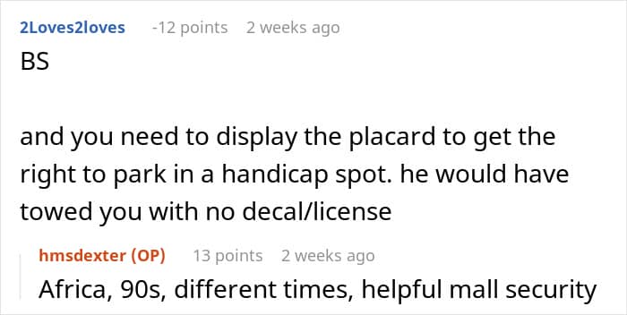 After some groveling and apologies from the entitled officer, OP and his dad decided they’d let him off with a warning. In an edit to his post, OP mentions that this all happened in South Africa in the late 90s and that his dad was well known to the mall security, which is probably why his car wasn’t towed for blocking the cop.