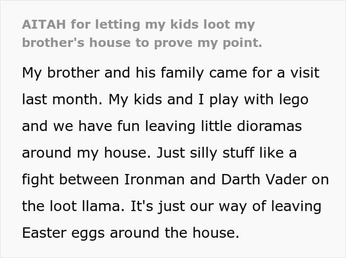 This was precisely the case for one man who had to get creative when his brother’s child “borrowed” his kids’ Lego pieces and took them home. When his brother repeatedly “forgot” to return them, the author decided to let his kids “reclaim” anything they wanted from his house, sparking a funny family standoff. Keep reading to find out how his brother reacted!