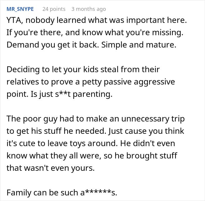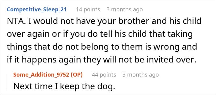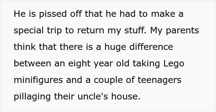 Just like in this case, where the author felt differently about his nephew’s behavior than his brother did. While his brother brushed off his 8-year-old’s “borrowing” a few Lego pieces, the author felt it was wrong, especially when his brother forgot to return them. The author was even willing to let his teenage kids “reclaim” items from his brother’s house as a response! What’s your take on this situation? Let us know your thoughts!