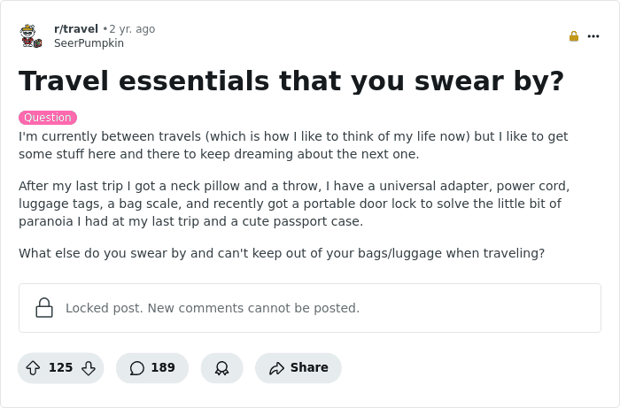 This list is a handbook of what the “must have” items in a travel bag are. All of the suggestions were shared by traveling netizens in various online communities, and since they swear by them, we can only guess that they’re useful. So, let’s see what they are, shall we?