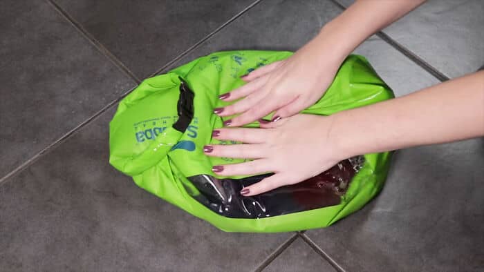 I most often use it to do laundry while traveling though: fill the dry bag (with dirty clothes) with warm water, add detergent, close, and knead/agitate around for a while. The agitation is what really cleans the clothes, and that is something that is difficult to achieve (just) in a sink. When done, let the soapy water out and rinse the clothes. Hang the dry bag along with the clothes to dry it, so it’s ready to use again.