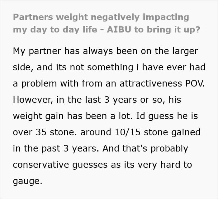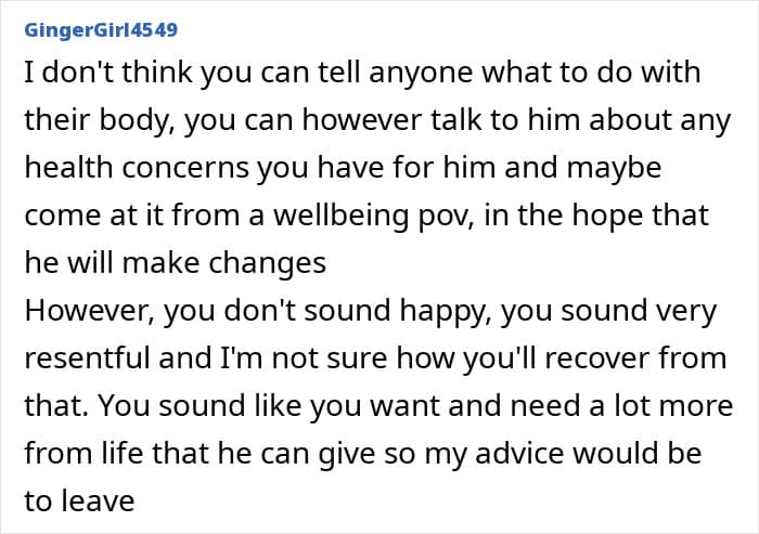 A woman who has been with her overweight partner for years reached her breaking point. The man had gotten heavier and unhealthier, which ultimately affected her well-being and their life together.