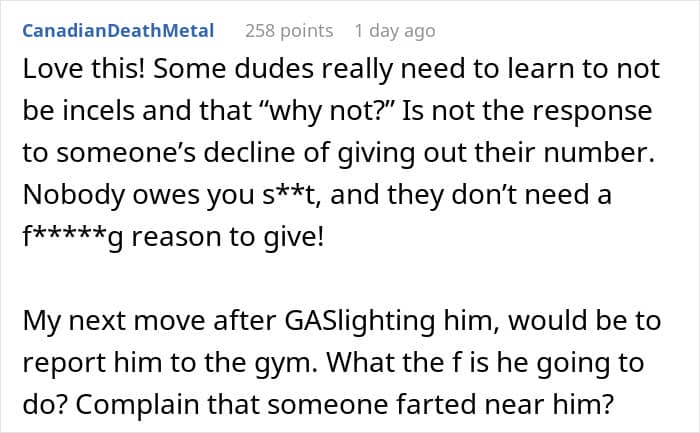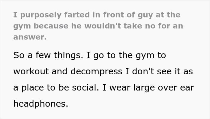 A woman on Reddit shared her creative way to get rid of a guy at the gym. The man wouldn’t take ‘no’ for an answer, so Redditor Titfortat101 had to resort to an unorthodox method. Read on to find out how this woman used one of her natural bodily functions to her advantage.