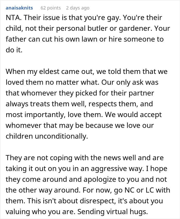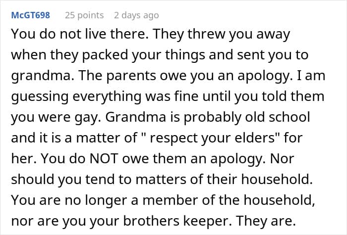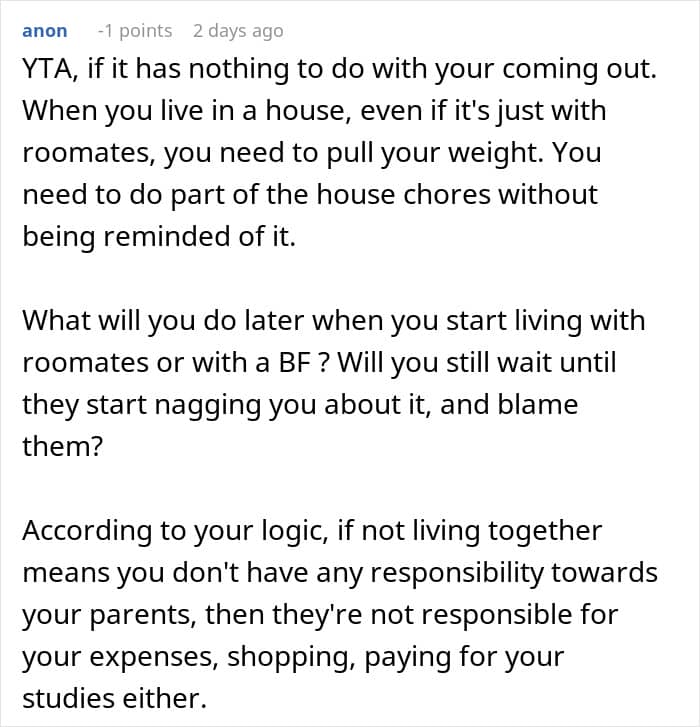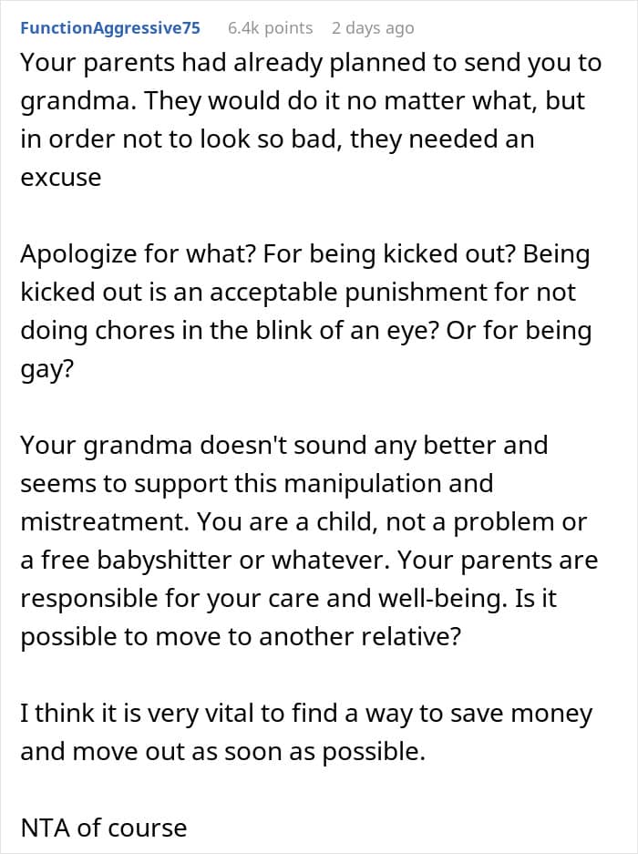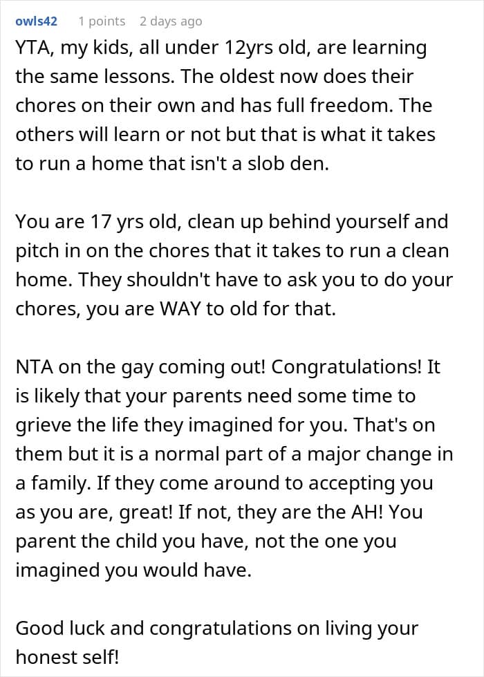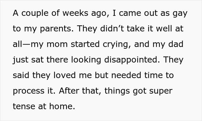 Even though the teenager’s coming out as gay has a lot to do with how his parents are acting, they seem to be raising their children in an authoritarian style. These parents often have high demands, enforce strict rules with little consideration for their kids’ feelings, and expect them not to question the reasons behind their rules.