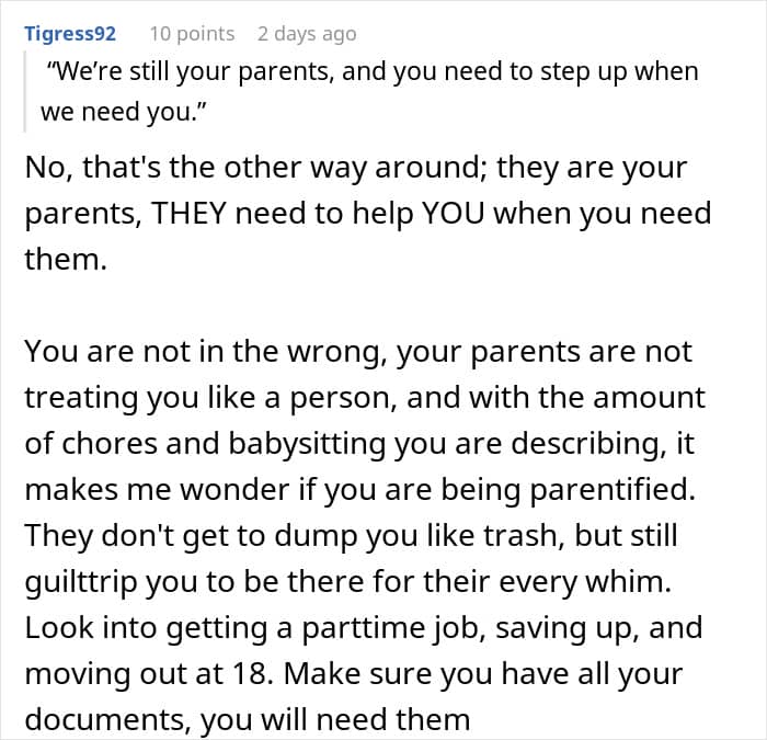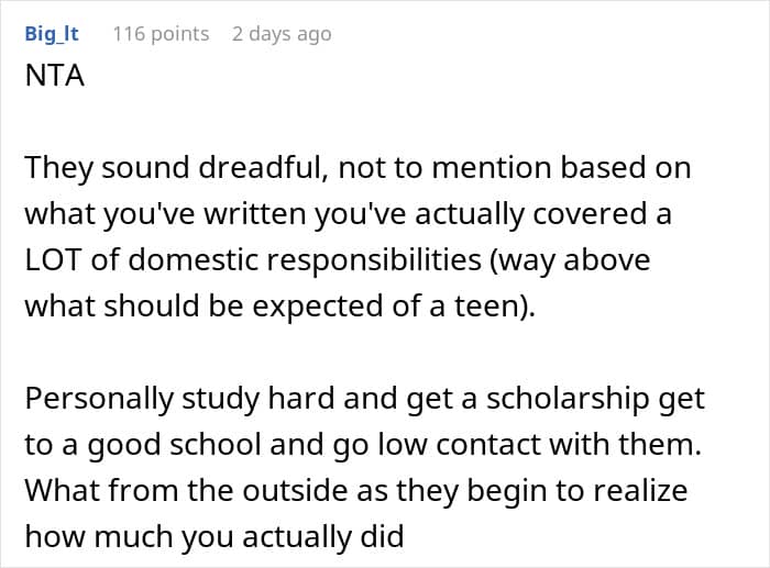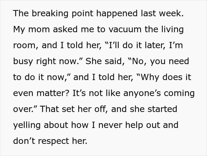 These parents have decided to lead with a more authoritarian style, demanding respect and imposing strict rules and punishments if they aren’t followed. Recently, their teen shared how they reached a breaking point after he delayed vacuuming the living room for which (in addition to other things) he was kicked out of the house.